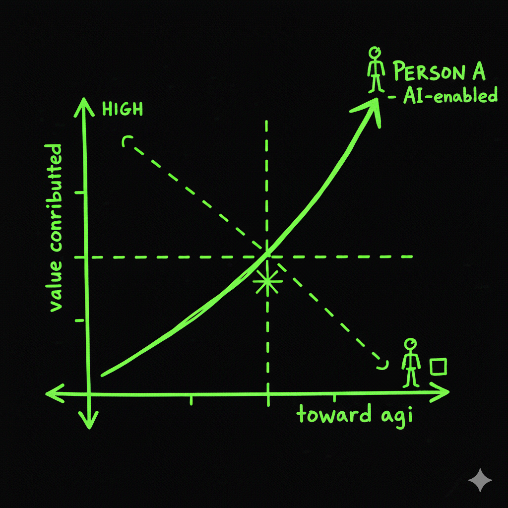 In this transitional phase, in many domains, Person A will increasingly output more value than Person B. The ability to model the model—working with something smarter than you—could matter more than your own problem-solving capacity.